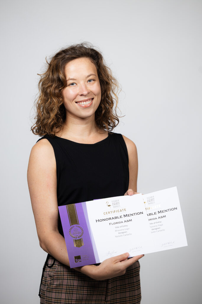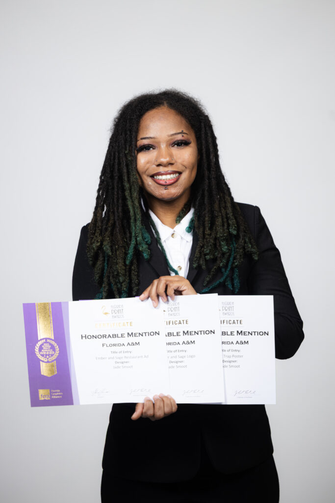 Student Tatiana Pedroso, who took home an Award of Excellence in the packaging design category for her project “CityFlare Bistro Merch,” represented FAMU SJGC at the ceremony and accepted the student awards on her peers’ behalf, with her family cheering her on. She had the opportunity to pose for photos with John Beadel, FGA’s board chair, whose congratulations message to this year’s winners noted that “judges were thoroughly impressed with the high caliber of submissions…. As the quality of work presented was outstanding across the board.”