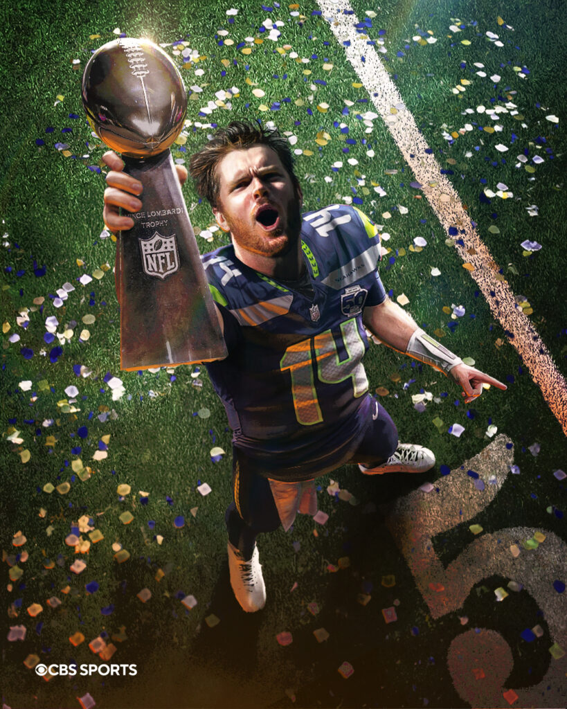 Drawing on the design skills he developed at FAMU and strengthened during his CBS Sports internship as an undergraduate, Jordan recreated one of the game’s most memorable moments. He produced a cinematic, aerial‑perspective graphic capturing Seahawks quarterback Sam Darnold lifting the Vince Lombardi Trophy toward the sky—a visual that quickly gained national traction.